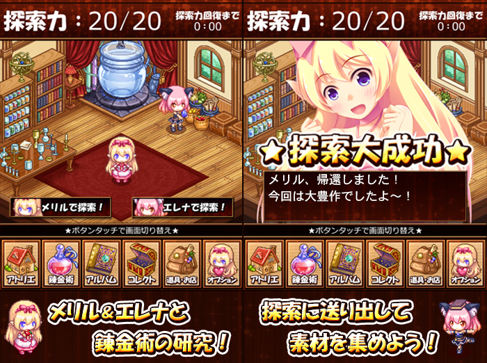 2人を探索に出して錬金素材を収集し、集めた素材を錬金してすべてのアイテムのコレクトを目指します。